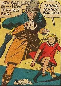 The Weeper is the arch-foe of Bulletman and Bulletgirl. His real name is Mortimer Gloom. He is capable of the most brutal of murders, but sheds tears for his victims. He wears a blue opera cape, a top hat and carries a wicked little walking stick. His arsenal also includes tear gas bombs. He also drives a hearse and is accompanied by his henchman, The Bittermen. He hates to see people happy but feels bad after he hurts them. (1)